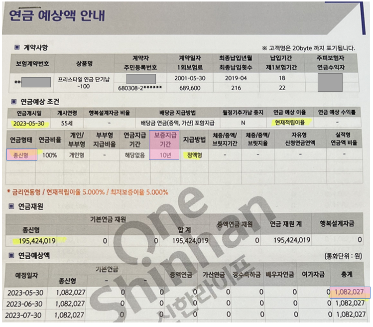 이 분이 은퇴를 하셔서 회사에 내가 종신형으로 연금을 받으려면 얼마를 받을 수 있는지 질의를 하니 회사는 “종신형 10년 보증”으로 월 108만원을 받을 수 있다고 합니다.