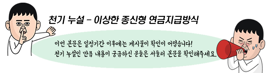 종신형 연금지급 방식은 생명보험회사에만 있다고 하는데…. 다른 금융권은 차마 이런 방식으로 하지 못해서 없는 게 아닐까… 하는 생각을 해 봅니다. 이게 복잡한 얘기가 아니니, 한 번 생각해 보시면 뭐가 이상한 건 지 곧 알 수 있죠.