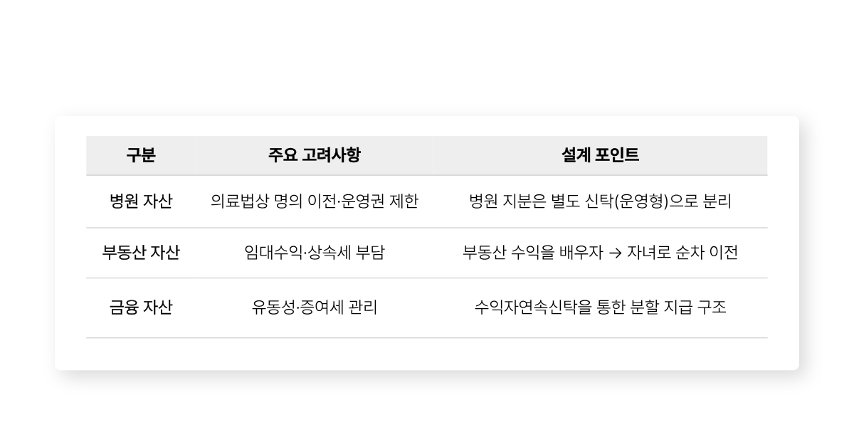 따라서 신탁 설계 시 다음 세 가지 축이 핵심입니다.