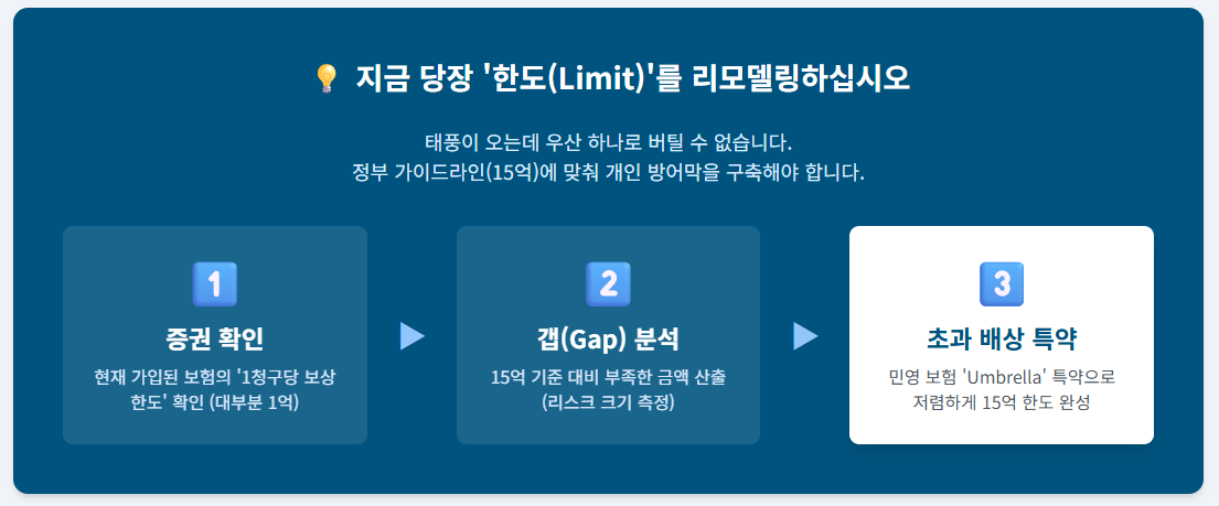 연간 보험료 절감을 위해 낮은 보장 한도를 유지하는 것은, 대형 재무 리스크 앞에서 무방비 상태로 노출되는 것과 같습니다. 정부의 가이드라인은 "최소 15억 원의 보장 자산 확보"를 권고하고 있습니다.