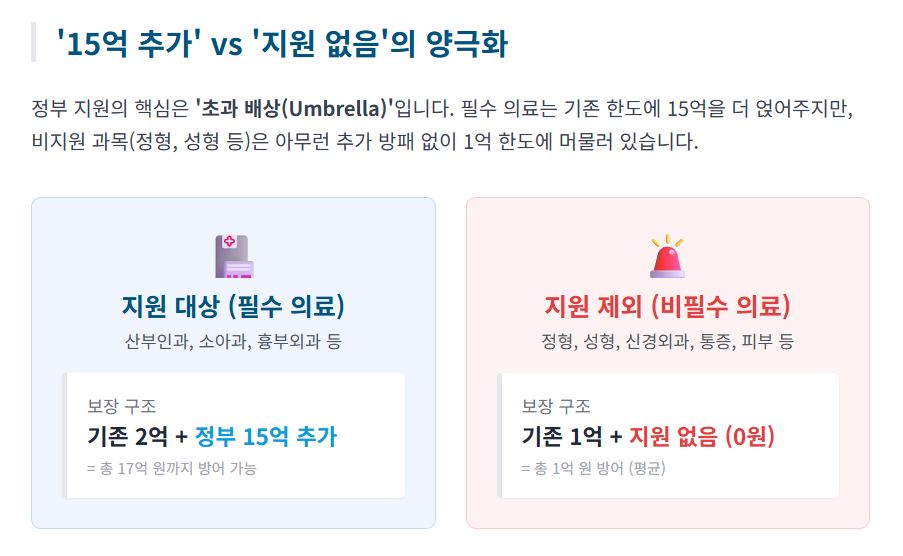 2025년 11월 26일부터 본격적인 가입 신청이 시작된 보건복지부의 '필수의료 배상보험료 국가지원' 사업은 산부인과(분만), 소아청소년과, 외과, 흉부외과 등 필수 의료 분야에 한하여 최대 15억 원의 보장 한도를 지원하는 것을 골자로 하고 있습니다.