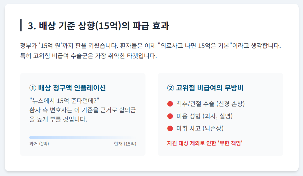 정부가 설정한 '15억 원'이라는 배상 한도는 향후 의료 소송 시장에서 손해배상액 산정의 새로운 준거 가격(Reference Price)으로 작용할 가능성이 높습니다. 이러한 시장 표준의 변화는 비지원 진료과목에 다음과 같은 구조적 리스크를 초래할 것으로 분석됩니다.
