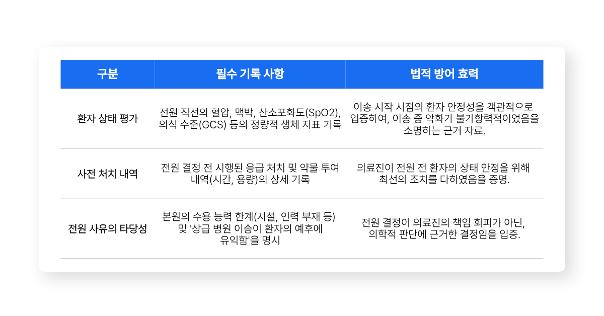 환자 상태의 급격한 변화는 주로 이송 과정에서 발생하며, 이에 대한 법적 면책을 위해서는 '전원 의뢰서'의 정밀한 작성이 필수적입니다. 분쟁 발생 시 의료진을 보호할 수 있는 핵심 기재 요건은 다음과 같습니다.