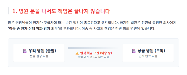 응급환자의 전원은 단순한 환자 이송이 아닌, '환자의 안전을 위한 최적의 의학적 판단'이었음을 입증해야 하는 법적 책임이 수반된 행위입니다.