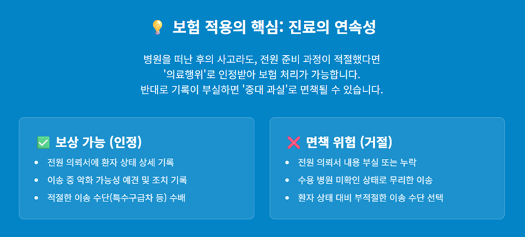 일반적으로 의료분쟁책임보험은 의료기관 내 사고를 담보하나, 전원 관련 사고의 경우 '진료 행위의 연속성' 관점에서 보상 여부가 결정됩니다.