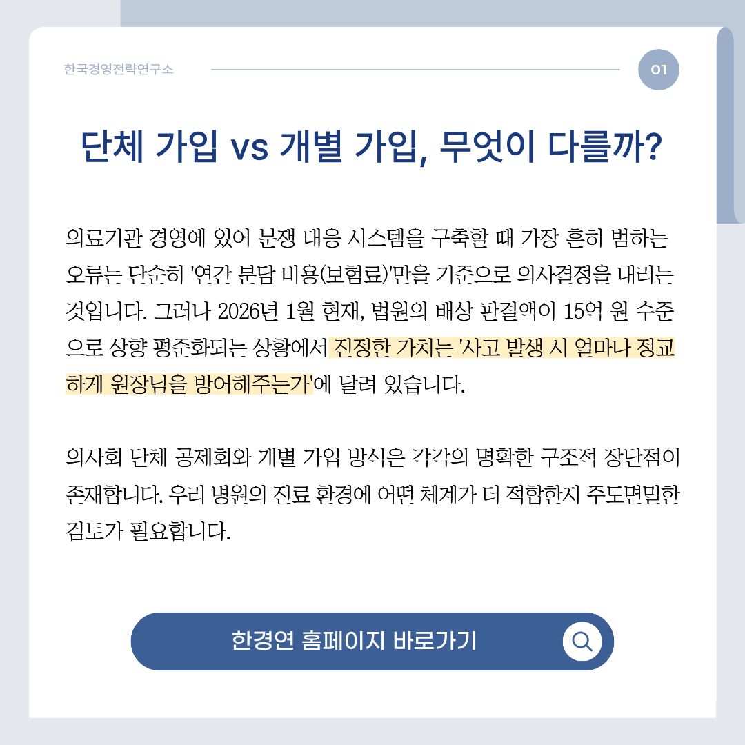 - 불확실성: 진료 과목이나 과거 분쟁 이력에 따라 분담 비용의 변동 폭이 크며, 원장님이 직접 관리해야 할 행정적 요소가 존재합니다.