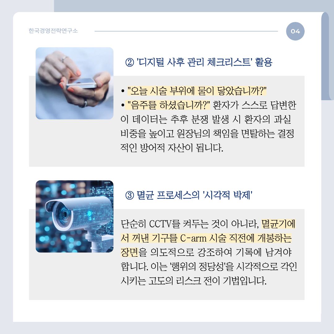 환자가 "시술 후 농양이 생겼으니 병원 탓"이라고 주장할 때, 단순히 "멸균을 잘했다"는 구두 해명은 힘을 얻지 못합니다. 이제는 개인의 숙련도를 넘어 병원의 시스템적 환경 데이터를 통해 감염의 인과관계를 차단해야 합니다.