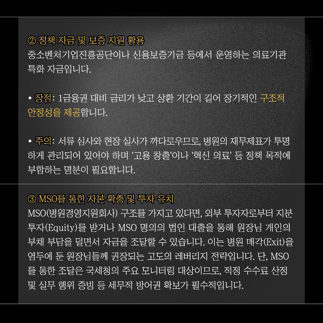 - 레버리지 비율의 적정성: 전체 매출 대비 이자 비용 비중이 일정 수준을 넘지 않도록 관리하여, 금리 변동이라는 불확실성 속에서도 병원의 영속성을 유지해야 합니다.