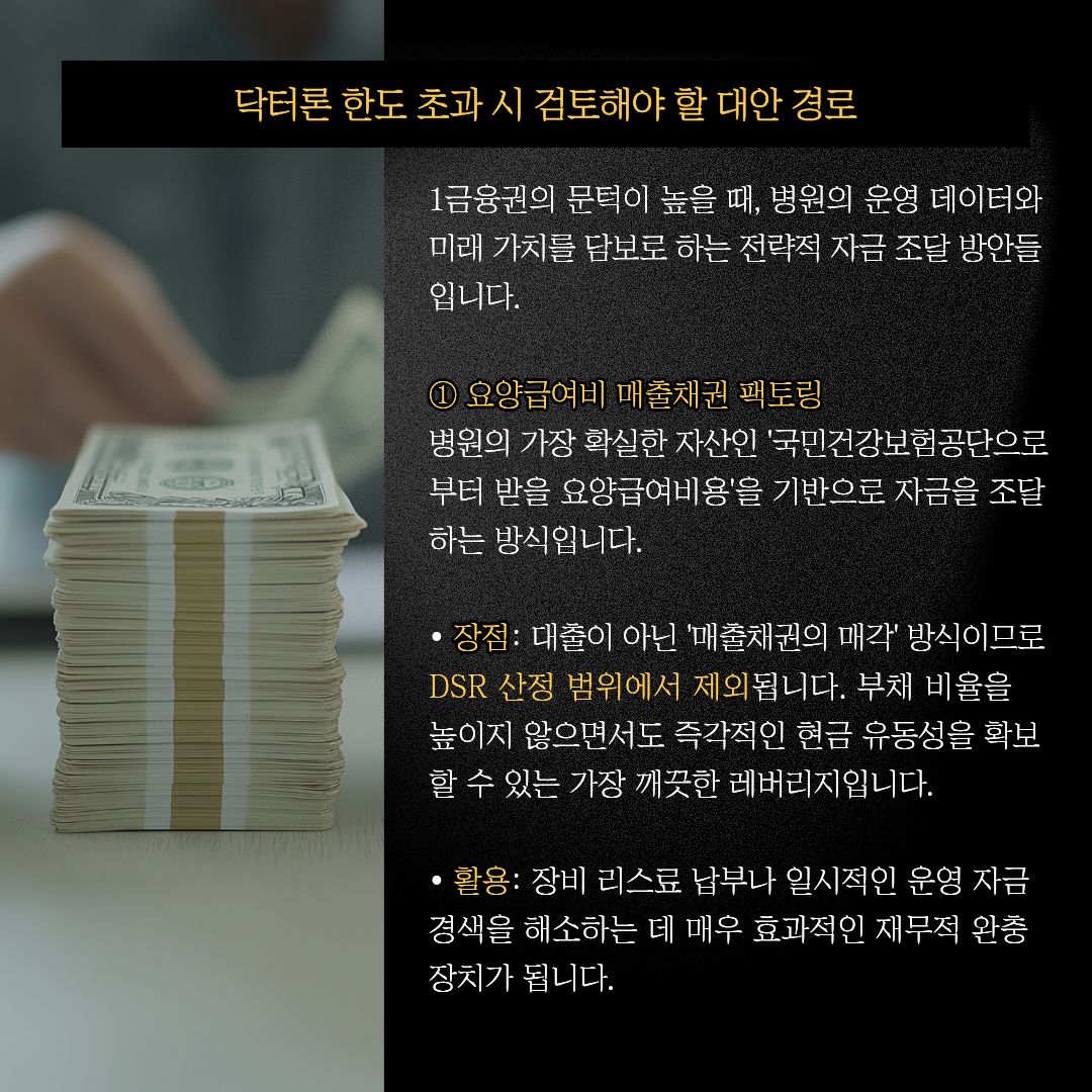 - 자금 구조의 다변화: 닥터론에만 의존하는 단선적 구조에서 탈피하여, 다양한 금융 도구를 혼합한 복합 재무 포트폴리오를 구축하고 계신가요?