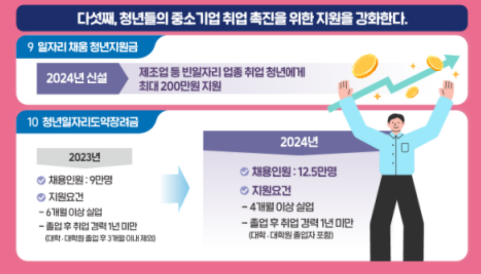 5인 이상 우선지원대상기업에서 취업 애로 청년들을 정규직으로 고용하고 6개월 이상 고용을 유지하는 경우에 최대 2년 동안 최대 1,200만원을 지원해주는 제도입니다. 첫 해에는 월 60만원씩 12개월 동안, 그리고 2년 근속 시에는 480만원을 일시 지급합니다. 또한, 지식서비스산업, 미래유망기업, 고용위기지역 소재 기업 등 5인 미만 기업도 이 혜택을 받을 수 있습니다.