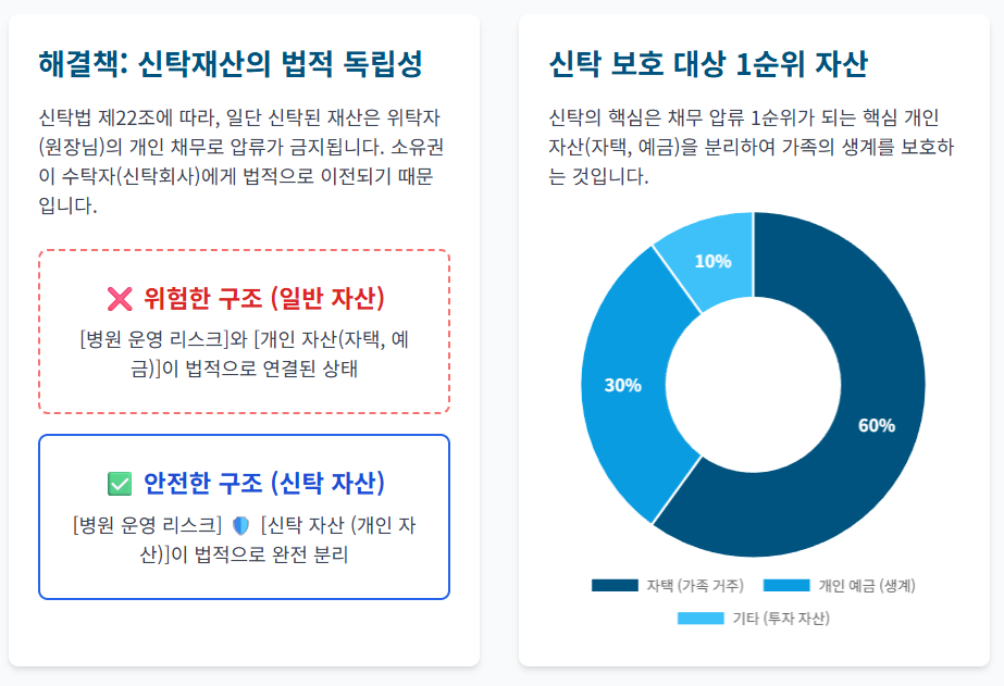 신탁을 통해 개인 재산을 법인 또는 병원 운영 채무로부터 분리하여 방어하는 것이 핵심입니다.