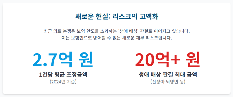 존경하는 원장님, 최근 몇 년간 산부인과, 소아과 등 고위험 진료과의 의료 분쟁은 '고액 배상'이라는 새로운 현실을 마주하고 있습니다. 의료사고 1건당 평균 조정금액이 2.7억 원을 상회하고, 신생아 뇌병변 같은 중증 사건에서는 20억 원 이상의 생애 배상 판결이 나오는 상황입니다.