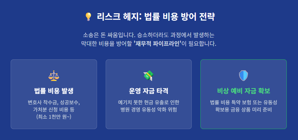 - 대응 방안: 이러한 우발적인 노무 및 법무 리스크 발생 시, 병원의 운전자금(Working Capital) 유동성을 저해하지 않고 즉각적으로 대응할 수 있는 '법률 비용 방어용 예비 자금(Emergency Fund)'을 별도로 조성하여 재무적 안전망을 구축해야 합니다.