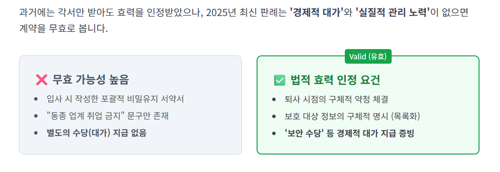 - 경업 금지: 2025년 최신 판례 경향에 따르면, 퇴사 후 동종 업계 취업을 금지하는 약정은 이에 상응하는 경제적 대가(경업금지 수당, 비밀유지 수당 등)가 지급되지 않은 경우 법적 효력을 인정받기 매우 어렵습니다.