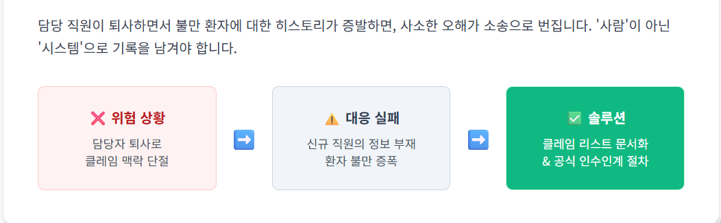 연말에는 퇴사하는 직원들이 많습니다. 그런데 이 직원들이 관리하던 '클레임 환자'나 '불만이 있는 분들'에 대한 정보가 제대로 전달되지 않으면 내년에 큰 사고가 터집니다.