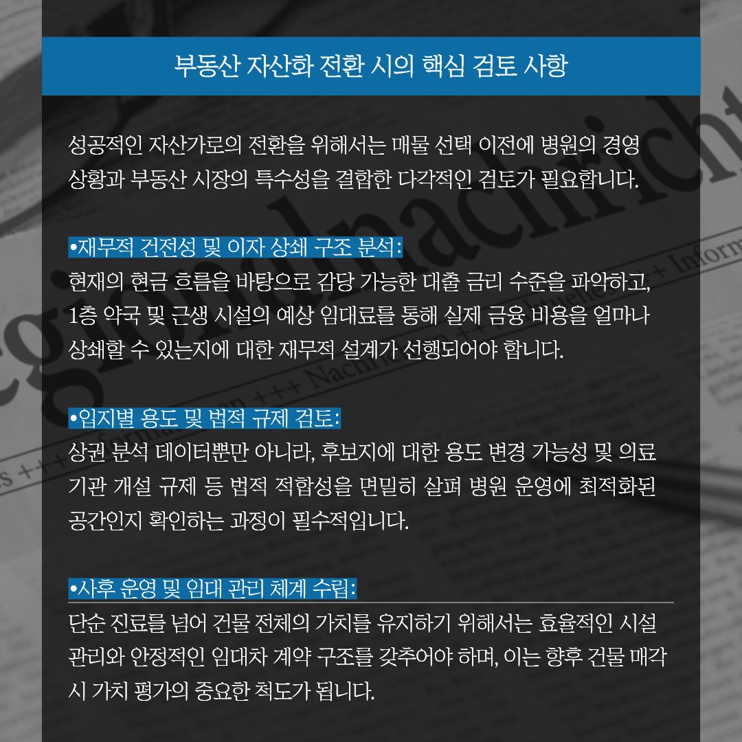 진료 실력만으로 수익을 창출하는 시대는 점점 한계에 다다르고 있습니다. 병원의 브랜드 파워를 부동산 가치로 치환하여 은퇴 시점의 유동성을 확보하는 전략적 판단이 필요합니다.