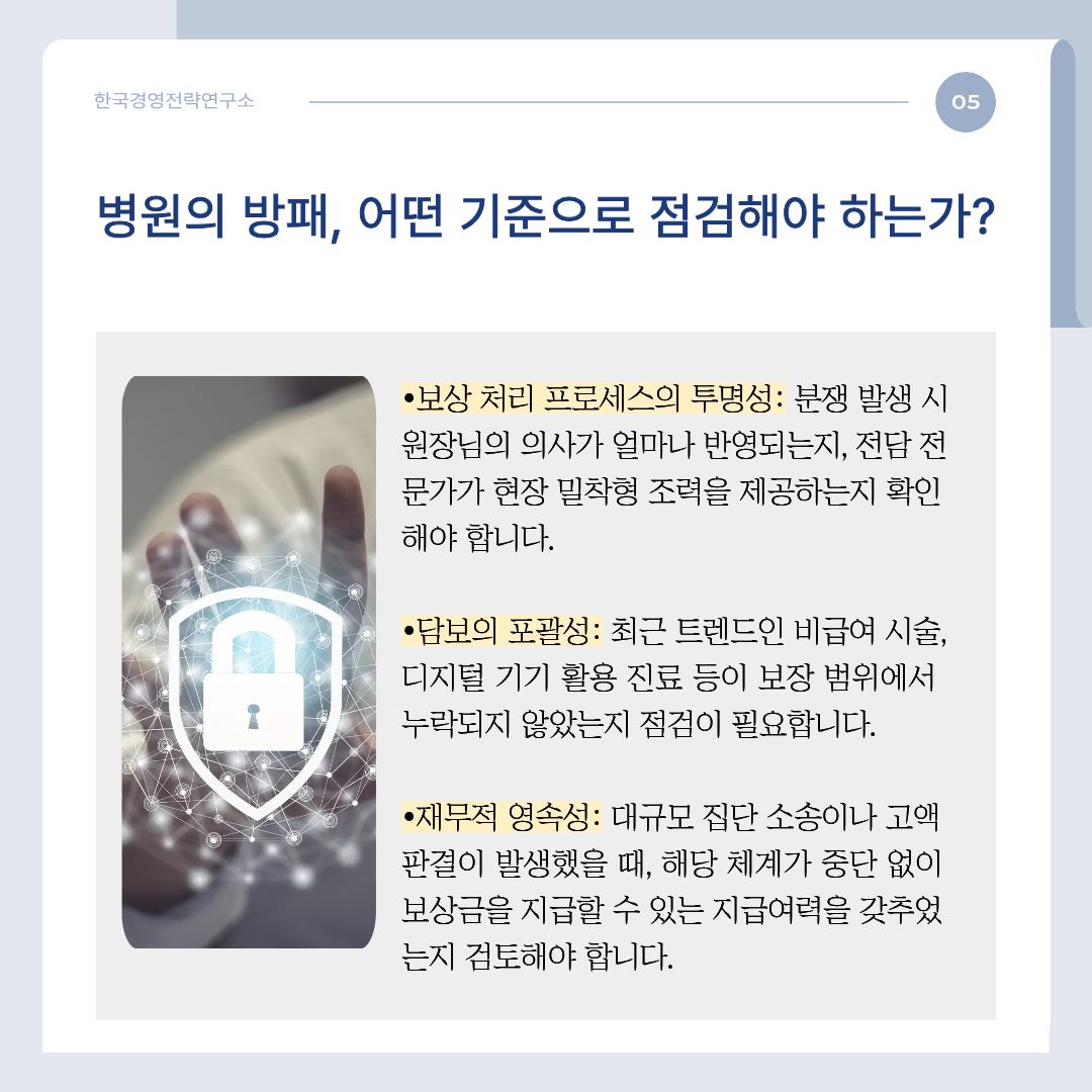- 불확실성: 사고 발생 시 보상 결정 과정이 다소 보수적일 수 있으며, 특정 진료 과목의 특수한 상황을 반영한 맞춤형 설계나 15억 원 이상의 초과 배상 대응력이 민영 체계 대비 경직될 수 있는 잠재적 위협이 있습니다.