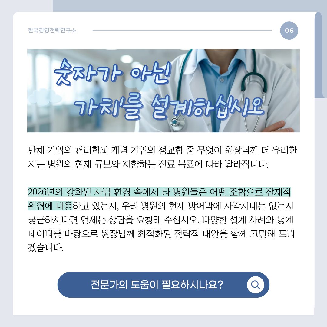 - 불확실성: 진료 과목이나 과거 분쟁 이력에 따라 분담 비용의 변동 폭이 크며, 원장님이 직접 관리해야 할 행정적 요소가 존재합니다.