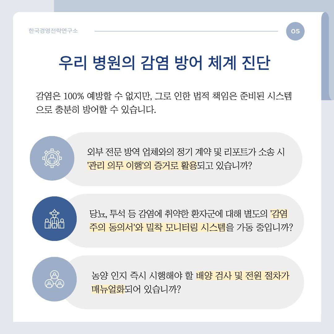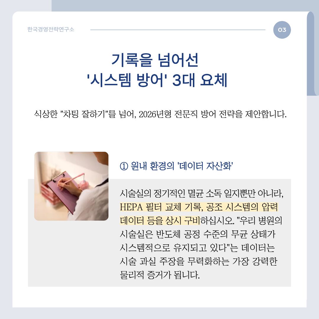 환자가 "시술 후 농양이 생겼으니 병원 탓"이라고 주장할 때, 단순히 "멸균을 잘했다"는 구두 해명은 힘을 얻지 못합니다. 이제는 개인의 숙련도를 넘어 병원의 시스템적 환경 데이터를 통해 감염의 인과관계를 차단해야 합니다.
