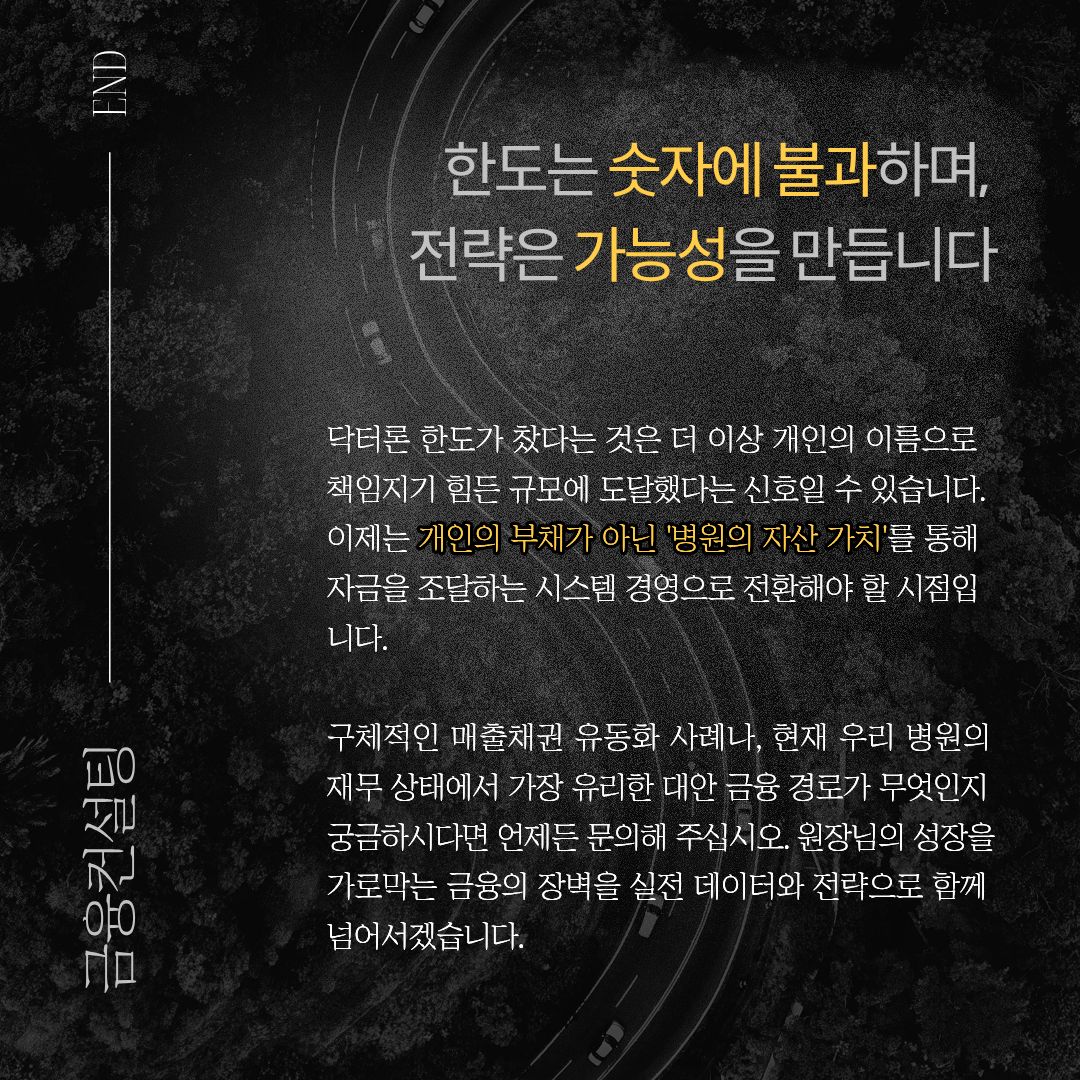 - 레버리지 비율의 적정성: 전체 매출 대비 이자 비용 비중이 일정 수준을 넘지 않도록 관리하여, 금리 변동이라는 불확실성 속에서도 병원의 영속성을 유지해야 합니다.
