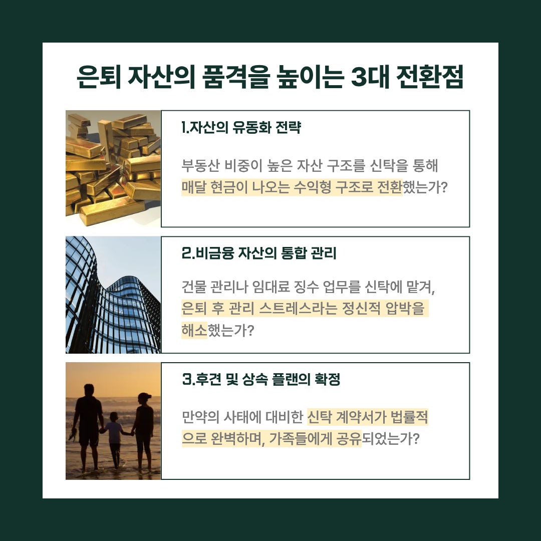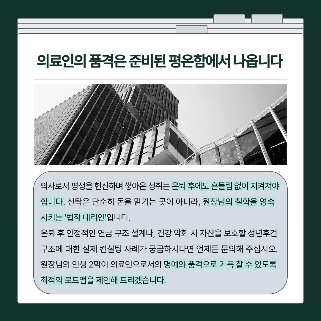 - 품격 있는 요양 환경 보장: 평소 원장님이 선호하던 요양 시설 이용료나 의료비가 신탁에서 자동 집행되도록 설계하여, 어떤 상황에서도 의료인으로서의 품격을 잃지 않게 합니다.