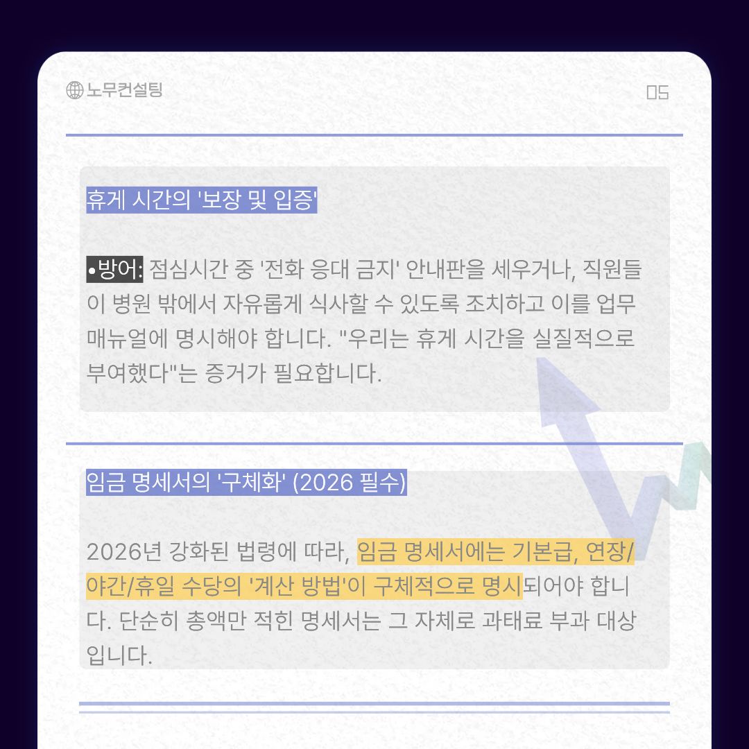 - 법적 판단: 직원이 자유롭게 병원 밖을 나가거나 개인 용무를 볼 수 없는 상태라면, 이는 휴게 시간이 아닌 '대기 시간(근로 시간)'으로 간주됩니다.