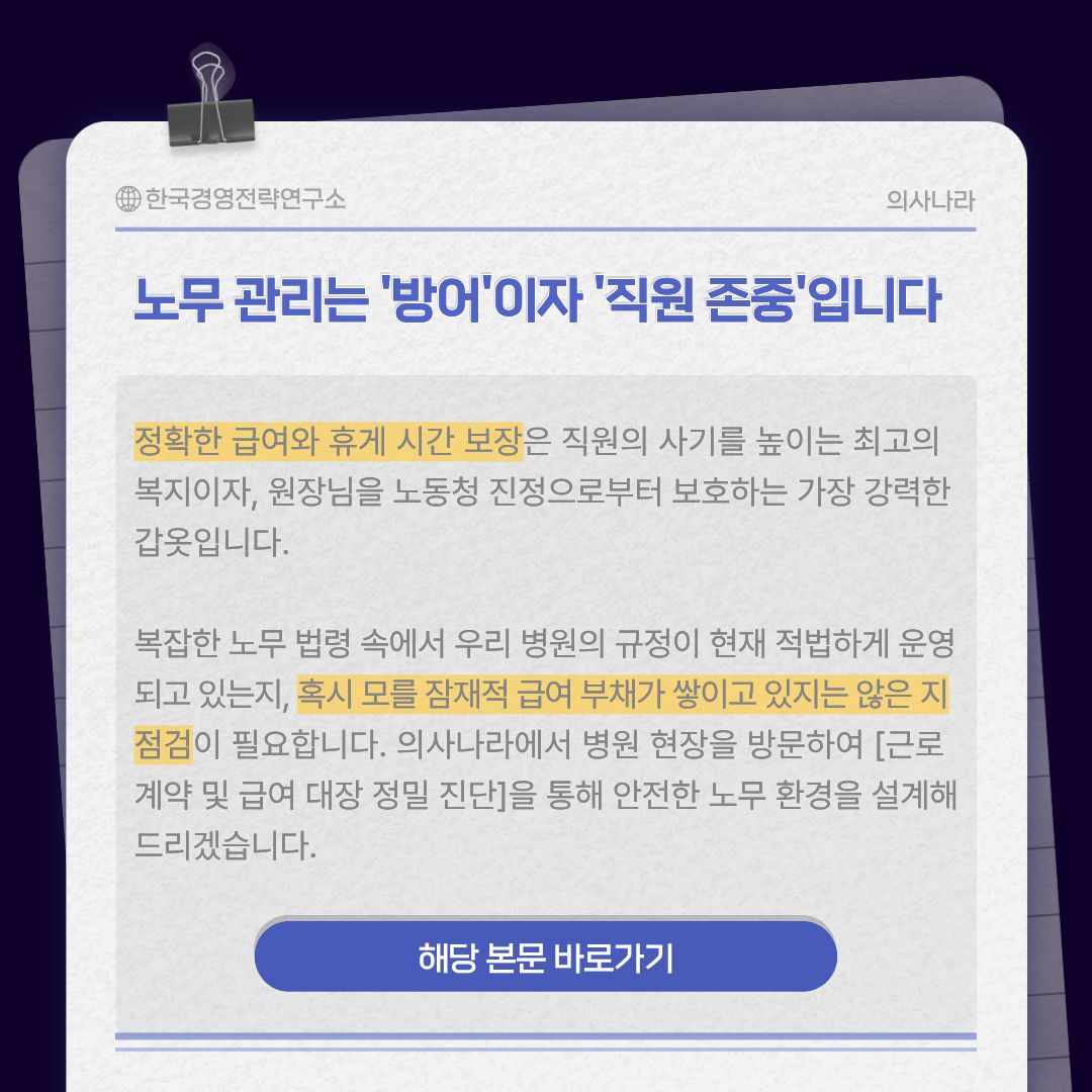 급여 대장은 단순한 숫자가 아닙니다. 병원의 노무 리스크를 보여주는 성적표입니다.